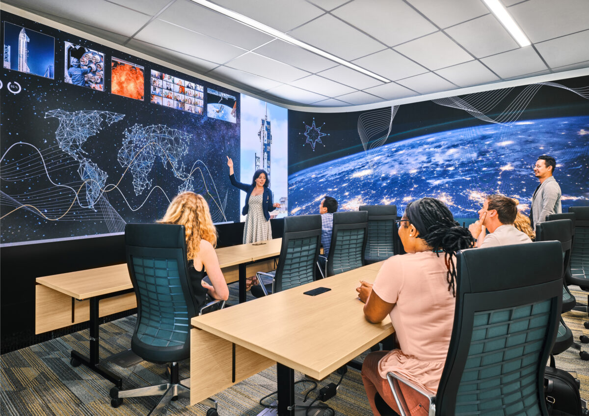 Within the facilities, students connect with the world in real-time using active and multi-dimensional technologies, which remain flexible for emerging technological innovations. With a modular approach to space planning, and AV and IT fit for future plug-and-play, the headquarters is prepared to adapt to short and long term needs of all users. All communal gathering spaces are designed for multi-use programming, with the ability to quickly transform from a study space to collaborative work or event space. In this way, Thunderbird becomes a central hub for both planned and serendipitous interaction.